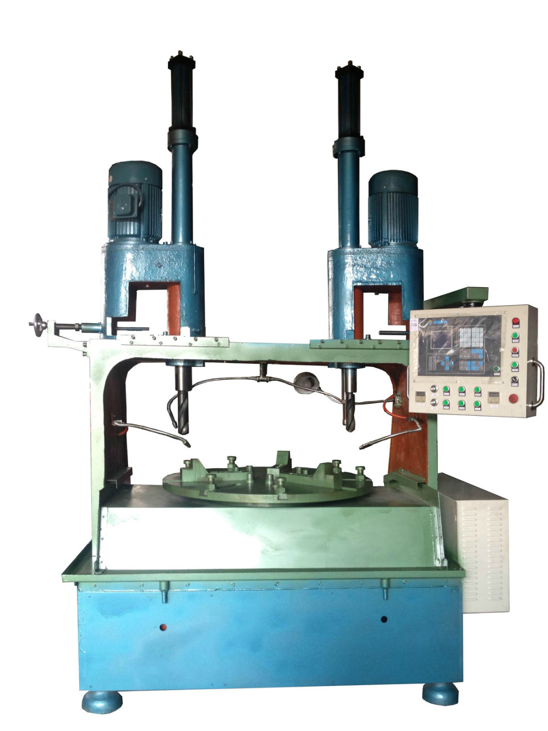 产品特点: 1.双头同时工作,生产效率高; 2.机械部分采用优质材料铸造,机械强度高; 3.采用油压式回转油缸驱动卡盘进行夹料,使用操作简单、方便; 4.配置TS400回转工作台,提高分度精度; 5.采用德亚CNC数控系统驱动步进电机进行分度,操作简便、精度高;6.机器自动分度、钻孔及攻牙,最大限度降低工人劳动强度,提高生产效率与生产过程中的安全系数。 适用产品规格(单位:mm)(尺寸可定制) ∅600、∅700、∅800、∅900、∅1000