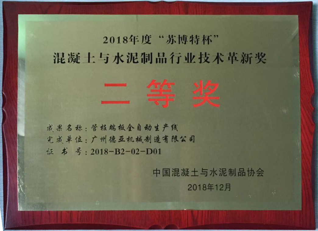 2018年12月1日,湖南长沙,本年度“中国混凝土与水泥制品行业大会”隆重召开,在会前表彰大会上,我公司独立研发的“管桩端板全自动生产线”荣获“苏博特杯”技术开发类二等奖。代表着德亚创智人不断努力,为行业智能装备产业升级做出的贡献得到了行业协会的高度认同与鼓励。