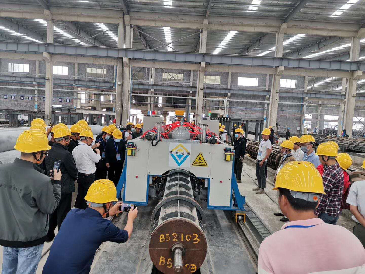 2020年10月25日广东省水泥制品与外加剂协会组织到四会市华誉联合管桩建材有限公司参观德亚创智PHC管桩智能化生产线。参观现场会员们被全自动喂料机、张拉机、放张机等深深吸引;在合/拆模机与全自动裙板一体机前,更是驻足不前。会员们对管桩设备智能化程度、实用性与安全可靠性赞不绝口。参观后更是多家企业表示需要与德亚创智进行下一步的商务洽谈。