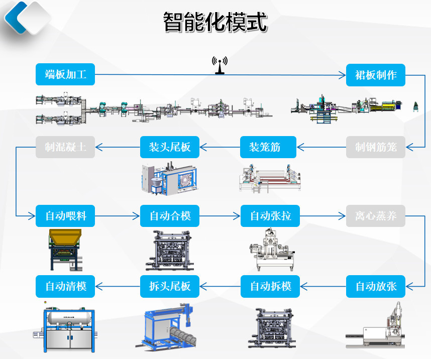 预应力混凝土智能生产线应用于建筑行业预应力混凝土管桩的生产,由全自动喂料机、全自动合模机、全自动张拉机、全自动拆模机、全自动清模机、全自动装头尾板机、全自动装笼机等设备组成,各设备具有识别不同型号的管桩规格,并自动调整相应的位置及技术参数,独立完成该工序的工艺操作要求。