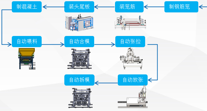 预应力混凝土管桩智能生产线包括全自动喂料机、全自动合模机、全自动张拉机、全自动拆模机、全自动放张机等,涉及37项独创性专利,其中12项发明专利。同时这一系列自动化设备已具备智慧工厂的基因,硬件与软件高度集成,能实现各种生产与设备实时数据、信息的自动采集,为智慧工厂的建设打下了坚实的基础。