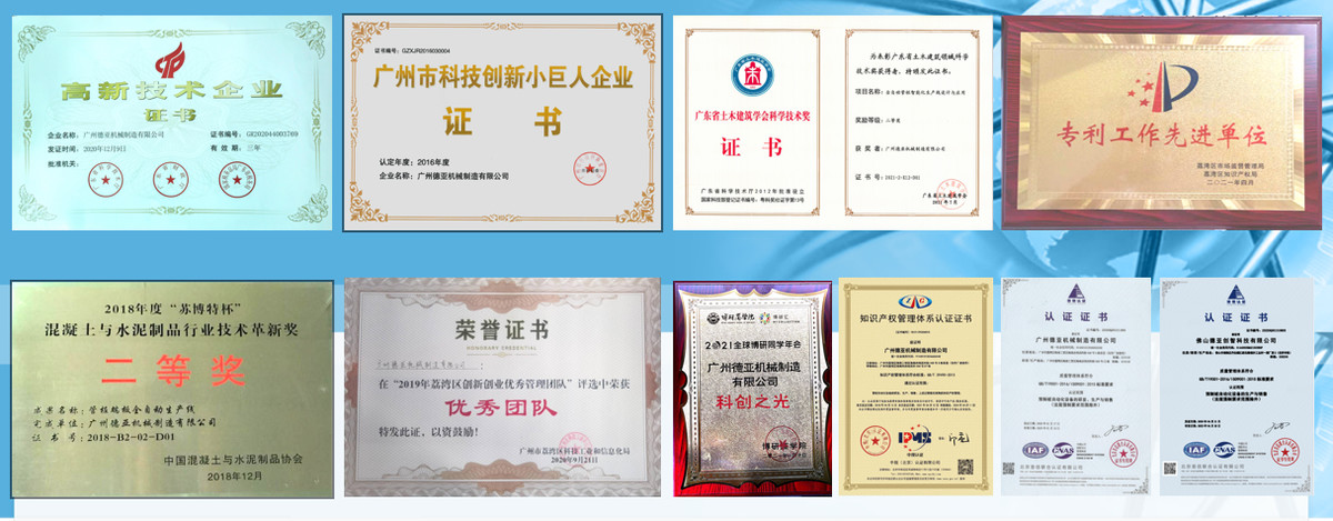 近年来,德亚创新发展成果显著,先后获得了中国混凝土与水泥制品行业“苏博特杯”技术革新奖、中国建材机械工业协会技术革新奖、广东省土木建筑学会科学技术奖、广东省知识产权示范企业、广州首台(套)重点技术装备推广奖、广州科技创新项目奖、发明专利产业化创新奖等殊荣。