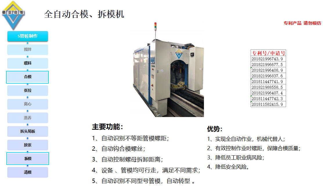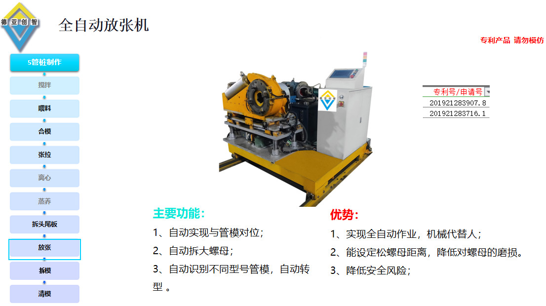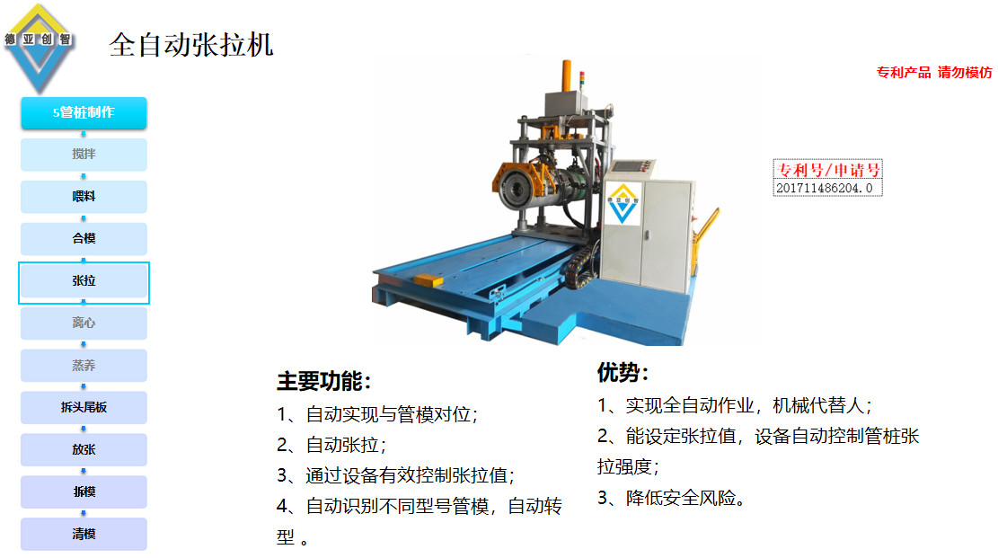 为配套“光伏桩”的应用,同时针对“光伏桩”直径小、规格跨度小等特点,公司先后研发出一系列经济实用的专用设备:全自动裙板一体机、全自动喂料机、全自动合模机、全自动张拉机、全自动拆模机、全自动放张机、全自动拆头尾板机、全自动清模机等;按智能程度分为半自动、全自动;以满足不同客户的需求,为PHC管桩在光伏产业中的应用保驾护航。