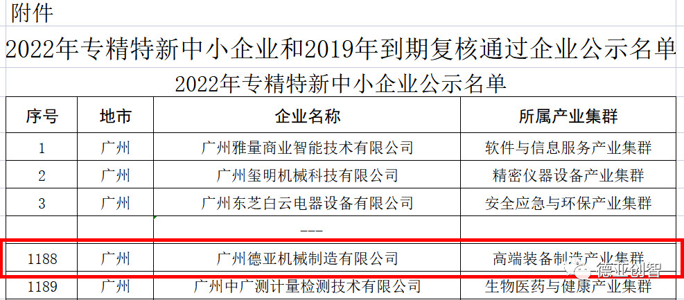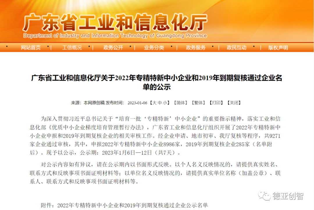近日,广东省工业和信息化厅公示了2022年专精特新中小企业名单,经过严格的审查和严谨的资质核定,九游(中国)成功入选,这是德亚发展过程中又一个重要的里程碑。