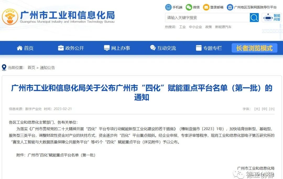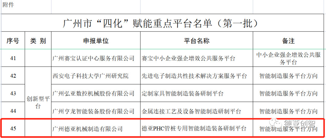 近日,广州市工业与信息化局公布了广州市“四化”赋能重点平台名单(第一批),我司申请的“德亚PHC管桩专用智能制造装备研制平台”成功入选创新型平台。